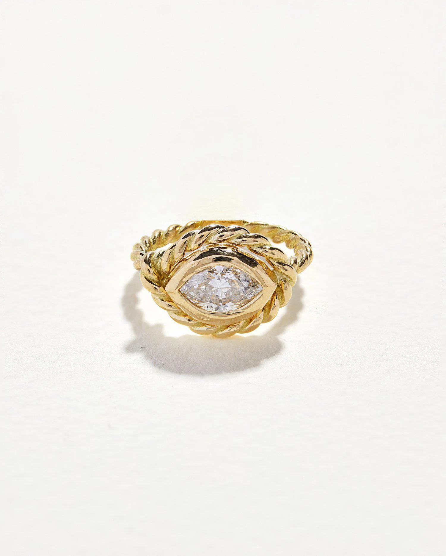 A twisted rope delicately wraps around a handpicked sparkling marquise cut diamond. Handcrafted in Brooklyn using recycled gold with ethically mined diamonds.